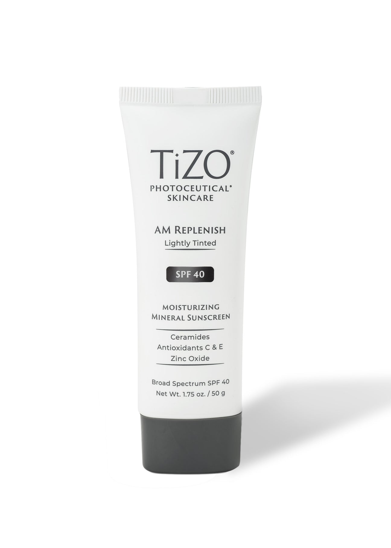 TIZO® AM Replenish Lightly Tinted is formulated with Zinc Oxide, Ceramides, and powerful Antioxidants (Vitamins C and E). Zinc Oxide protects against UV damage and Ceramides help restore the lipid layer. TIZO® AM Replenish helps prevent future UV damage and aids in the repair of existing damage resulting in long lasting moisturization.